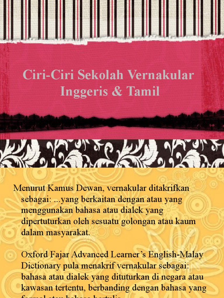 Sekolah vernakular merujuk kepada sekolah yang menggunakan bahasa ibunda dalam pelaksanaan penyelidikan dan pembangunan p p di sekolah. Terdapat tiga jenis sekolah vernakular iaitu melayu cina dan tamil.