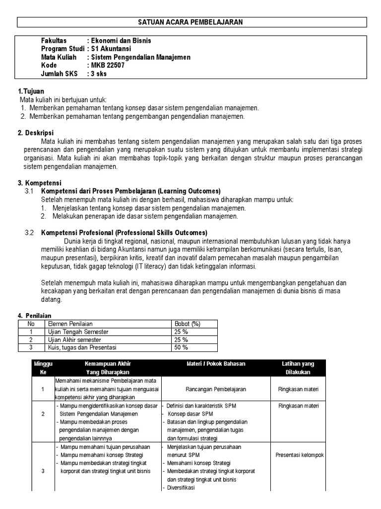 Satuan Acara Pembelajaran Fakultas Ekonomi Dan Bisnis Program Studi S1 Akuntansi Mata Kuliah Sistem Pengendalian Manajemen Kode Mkb 22507 Jumlah Sks 3 Sks 1 Tujuan